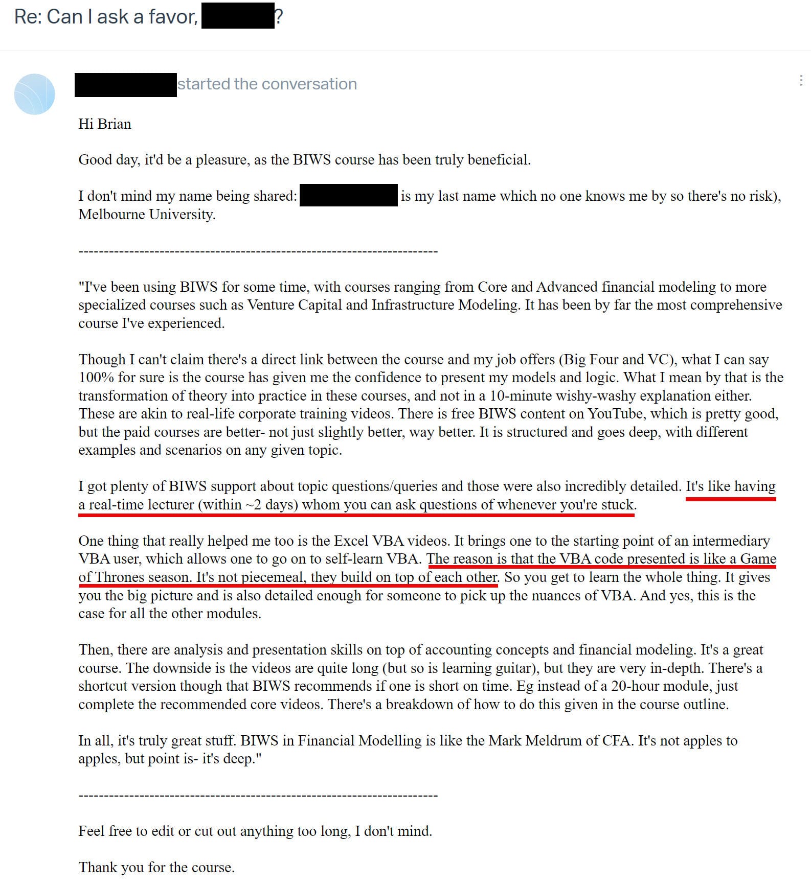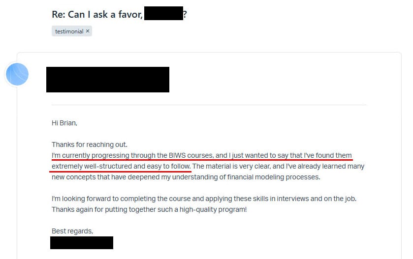 This personalized, expert support is one of the things that sets Breaking Into Wall Street apart and gets you to your goals faster.