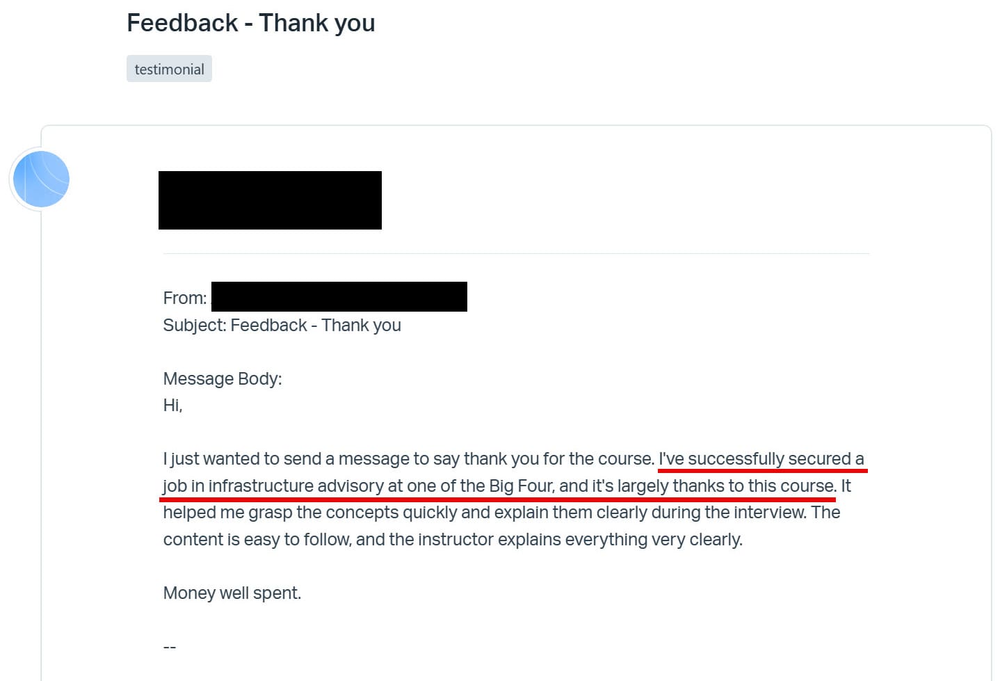 "I've successfully secured a job in infrastructure advisory at one of the Big Four, and it's largely thanks to this course."