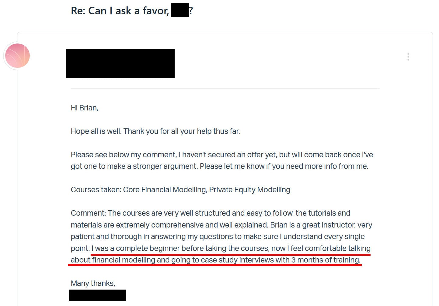 "Now I feel comfortable talking about financial modelling and going to case study interviews with 3 months of training."